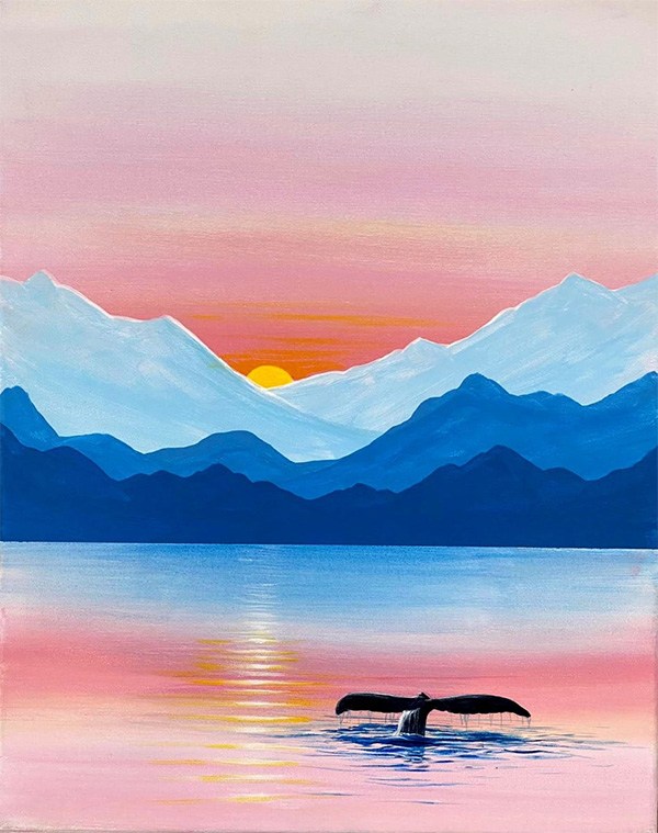 You will be creating the featured painting shown below, and a master artist will walk you through it step by step. All supplies, artist instruction and aprons are included with your ticket. You may bring in food, but all drinks need to be purchased. Please do not bring in your own drinks. They have non-alcoholic drinks available for purchase.